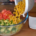 Cortamos la cebolla en trozos pequeños y seguido la ponemos junto a las patatas, también troceamos los aguacates, y los tomates que previamente les quitaremos la piel, escurrimos el maíz cocido y ponemos todo en el recipiente junto a las patatas.