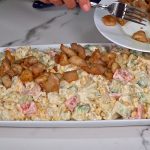 6. Vertemos la ensalada en la bandeja de servir y repartimos por encima el pollo frito, y lista para disfrutar.