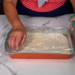7 Pasado el tiempo de la tercera fermentación preparamos una bandeja de horno con un buen chorro de aceite en el fondo de la misma, vertemos la masa dejándola caer directamente en la bandeja (Foto 11), con las manos repartimos la masa para dejarla pareja y dejamos fermentar por última vez cubriendo la masa con papel film durante otros 20 minutos (Foto 12).