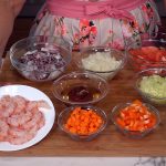 2. Cortar en trocitos la cebolla, los ajos, lavamos el puerro y también lo cortamos en trocitos, picamos unas hojas de perejil, pelamos el pimiento rojo y lo troceamos, pelamos y cortamos en trocitos la zanahoria y los tomates pelados, limpiamos los calamares y después los cortamos en rodajas, también quitamos la piel a las gambas.
