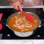 9. Retiramos la ñora y seguido incorporamos las gambas, apagamos el fuego, tapamos la olla y dejamos reposar unos 5 minutos y listo para disfrutar.
