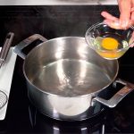 3. Ponemos una olla al fuego con abundante agua a calentar a fuego fuerte, añadimos un par de cucharadas de vinagre y cuando comience a hervir formamos un remolino con una cuchara en el centro de la olla y rápidamente vertemos un huevo que es mejor tener preparado en un bol, enseguida bajamos a fuego mínimo y escalfamos el huevo durante 3 minutos justos.