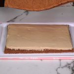 12. Cortamos el bizcocho por la mitad y colocamos una mitad sobre la bandeja, repartimos por encima la mitad de la crema de café y la extendemos, colocamos encima la otra mitad del bizcocho y por encima repartimos la otra mitad de crema dejando la superficie lisa y pareja.