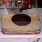 13. Colocamos un aro o papel de acetato por el contorno del pastel reservamos y vertemos por encima la ganache, repartimos la ganache para que cubra la superficie y reservamos en la nevera unas 3-4 horas.