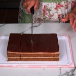 14. Antes de servir retiramos el aro o papel de acetato del contorno y recortamos los 4 laterales para dejar el contorno bonito, marcamos y cortamos con un cuchillo caliente, (ponemos agua hirviendo en un recipiente alto y dejamos dentro del agua un minuto el cuchillo, secamos con servilleta de papel y así se corta fácil y limpiamente) en porciones y listo para disfrutar.