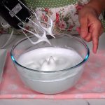 5. Batimos con varillas eléctricas las claras hasta que formen espuma, seguido añadimos el vinagre o zumo de limón y seguimos batiendo hasta que estén a punto de nieve, añadimos en un par de veces 60g o 4 cucharadas de azúcar y batimos unos 5 a 7 minutos o hasta que sea un merengue firme.