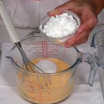 2. A la leche que hemos reservado añadimos 4 yemas y 2 huevos enteros, batimos un poco y seguido añadimos el azúcar y la maicena o almidón de maíz, mezclamos hasta que no queden grumos.