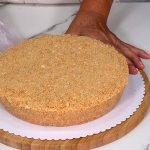 7. Vertemos la crema en el molde y alisamos la superficie, repartimos por encima la mezcla de bizcochos cubriendo la superficie presionando ligeramente, cubrimos con papel film y dejamos reposar en la nevera durante 4 horas o de un día para el otro.