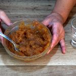 4 Vertemos la crema en un recipiente aparte y la cubrimos con papel film (Foto 9), la dejamos enfriar a temperatura ambiente. Ponemos el dulce de membrillo en un recipiente grande y le añadimos 2 o 3 cucharadas de agua hirviendo, removemos hasta que quede cremoso (Foto 10), y lo reservamos para mas adelante