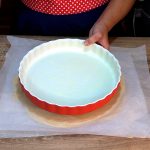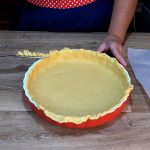 Después con la ayuda del papel donde hemos estirado la masa la ponemos dentro del molde previamente untado con mantequilla y reservado en la nevera, quitamos el papel y ajustamos la masa con los dedos, si se rompe se repara colocando un trocito de masa encima y listo, recortamos la masa sobrante con un cuchillo.