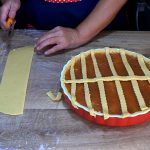 8 Cortamos tiras de un centímetro más o menos de ancho por todo el largo de la masa y las colocamos sobre el dulce de membrillo (Foto 17), una vez formada las filas de masa colocamos otras filas encima formando un enrejado (Foto 18), también ponemos unas tiras todo al rededor.