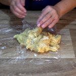 2 Añadimos la levadura química o polvos de hornear a la harina y mezclamos un poco, añadimos la pizca de sal a la mezcla y seguido la harina, batimos hasta que se incorporen los ingredientes, sin sobrebatir la masa (Foto 4), raspamos con la espátula el fondo y el lateral y después volcamos la masa sobre papel film (Foto 5), envolvemos y dejamos en la nevera al menos una hora.